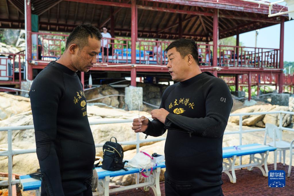 王丰国(右)在传授珊瑚移植作业中扎带的捆绑经验(5月17日摄)。