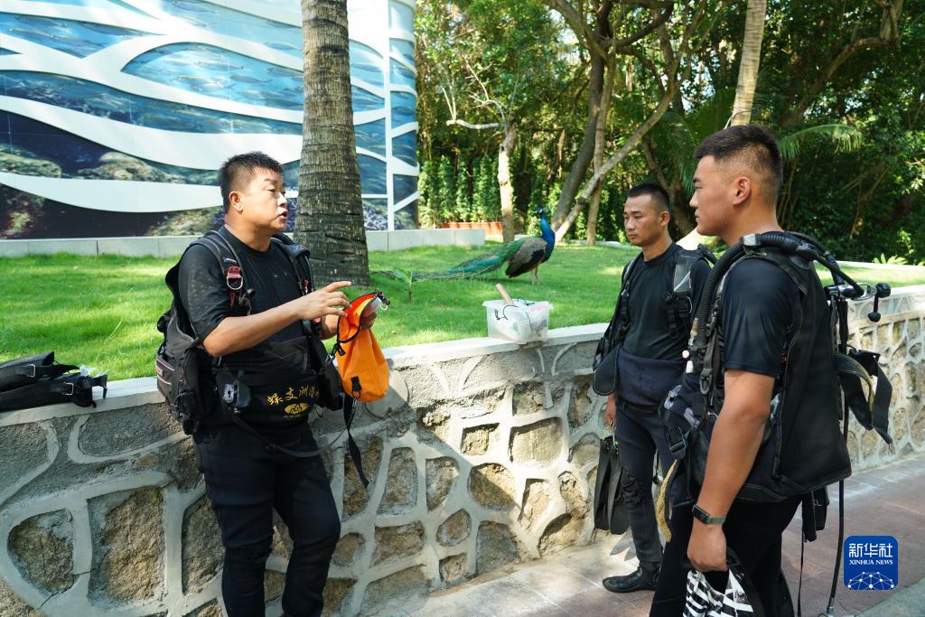 王丰国(左)在水下作业前,为部门工作人员安排具体工作内容,讲述相关注意事项(5月17日摄)。