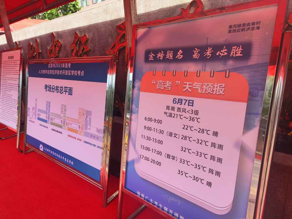 6月7日,在人大附中北京经济技术开发区学校考点,张贴着“高考”天气预报等温馨提示。新华社记者 赵琬微 摄