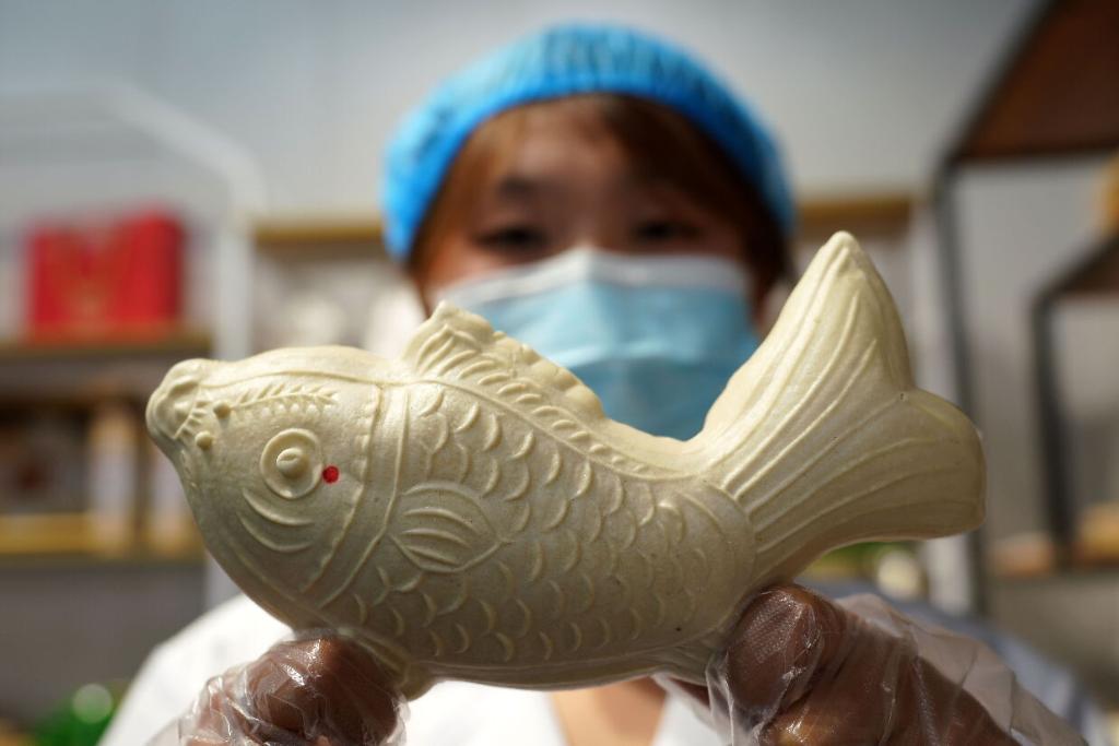 5月25日,在河北沧州渤海新区黄骅市河北银海农业科技有限公司产品展示区,工作人员展示面花产品。新华社记者 骆学峰 摄