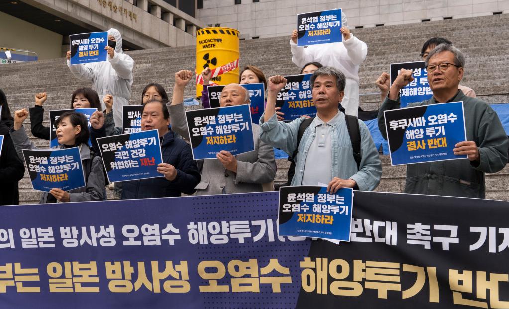 2023年4月25日,在韩国首尔,民众手举标语抗议日本政府核污染水排海计划。新华社发(李相浩摄)