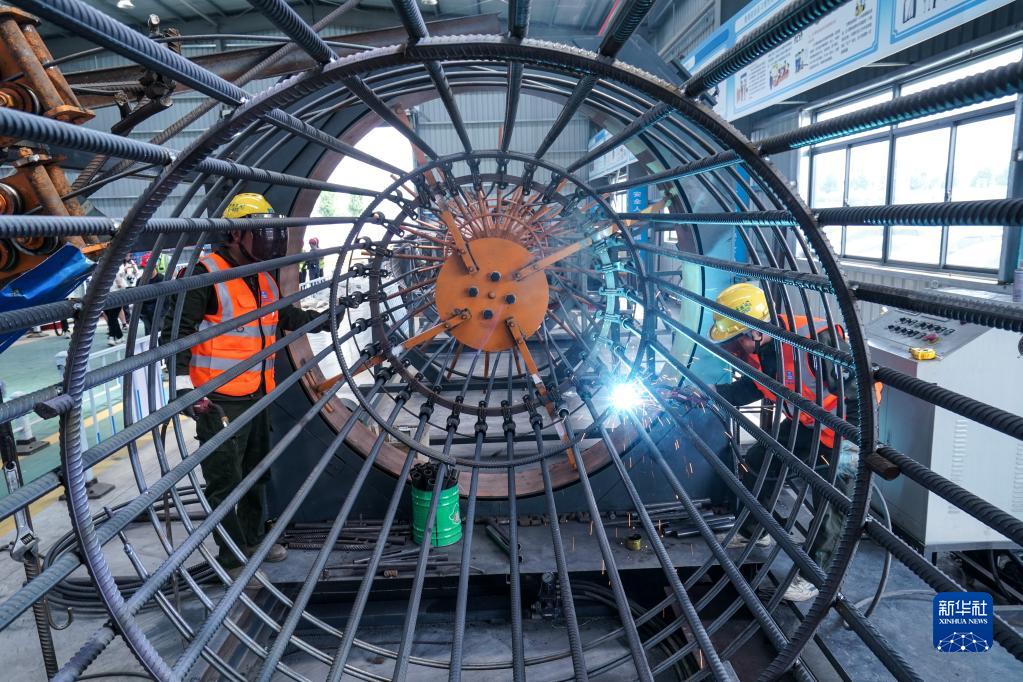 工人在长深高速公路连云港至淮安段扩建工程主体施工项目钢筋集中加工及配送中心加工预制件(6月7日摄)。