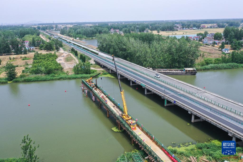 工人在长深高速公路连云港至淮安段扩建工程柴米河大桥施工现场搭建施工便桥(6月7日摄,无人机照片)。