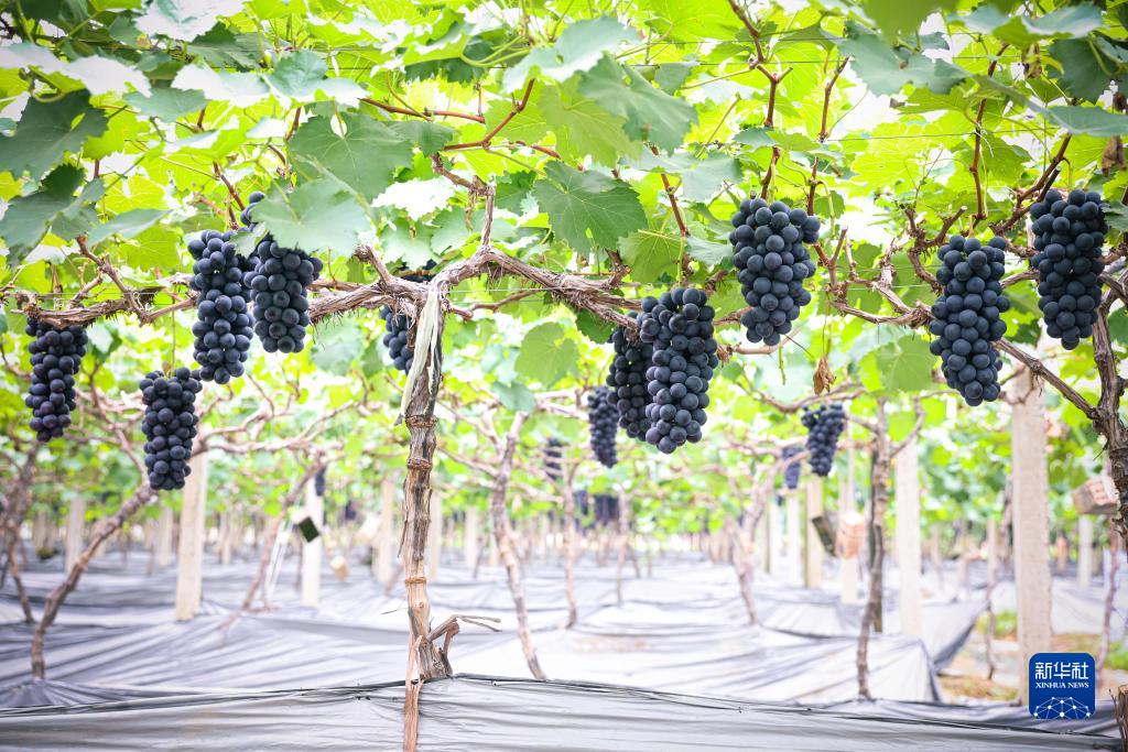 江北区曙波果蔬农场大棚内的葡萄藤上挂满了颗粒饱满的葡萄果实(6月8日摄)。