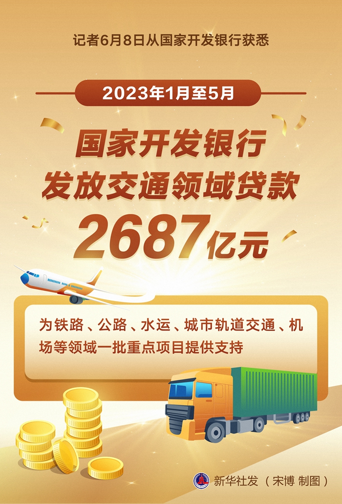 新华社北京6月8日电(记者刘羽佳)记者8日从国家开发银行获悉,今年1月至5月,该行发放交通领域贷款2687亿元,为铁路、公路、水运、城市轨道交通、机场等领域一批重点项目提供支持。