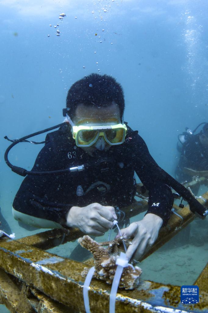 6月8日,海南省海洋与渔业科学研究院的专家和潜水员在海南陵水分界洲岛附近海域移植珊瑚。