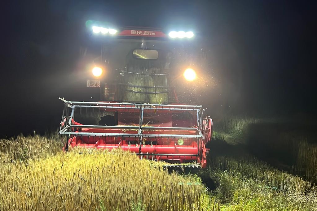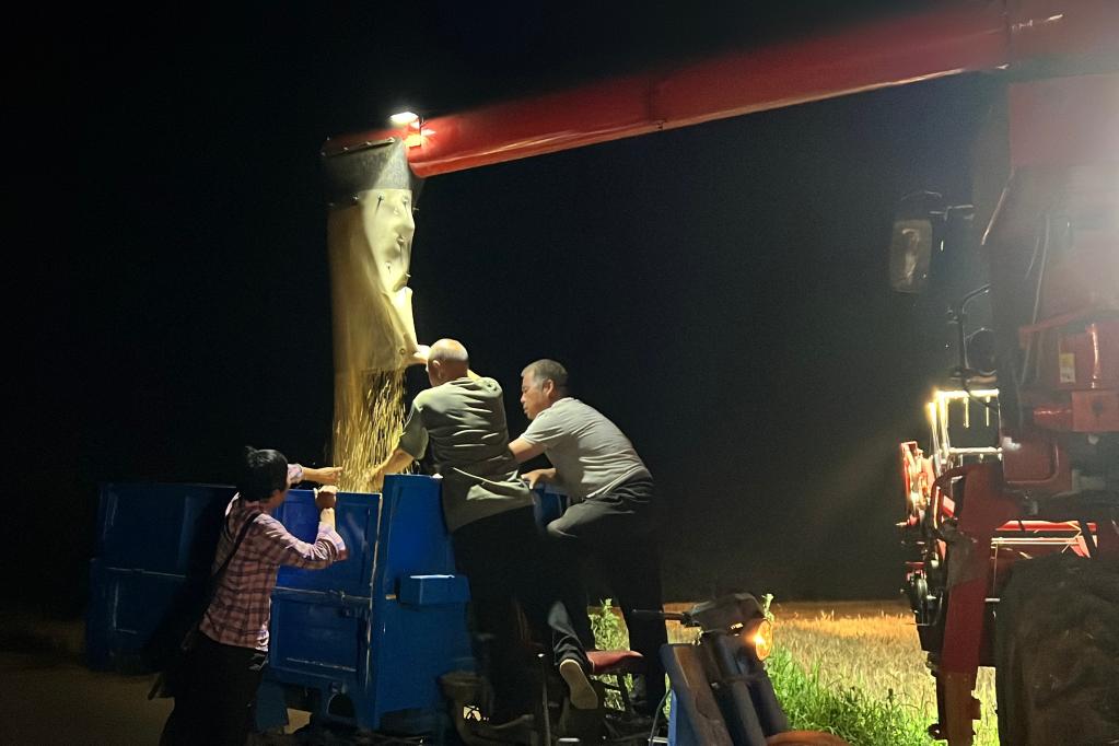 夜幕降临,山西省运城市一些地方的麦田里,收割机的轰鸣声还在继续,车灯将前面的麦地照得通明。