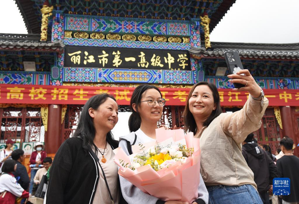 6月8日,在云南丽江市一中考点,考生在考试结束后与家人合影。