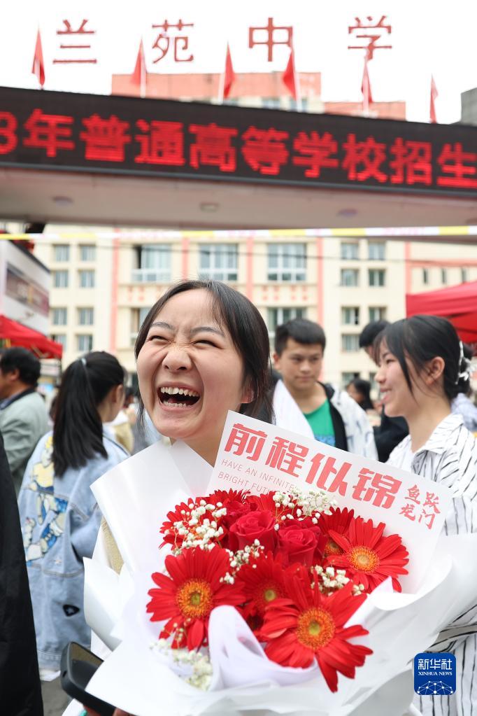 6月8日,在贵州毕节市七星关区兰苑中学考点,一名考生手捧家长送的鲜花开心大笑。