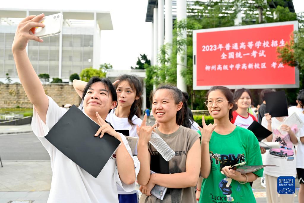 6月8日,在广西柳州高中考点,结束高考的考生在考场外留影。