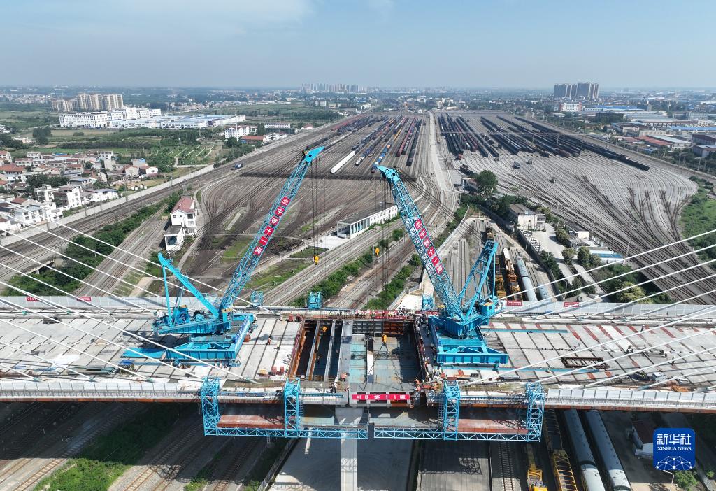6月8日,中铁十一局施工机械将襄阳北编组站大桥的最后一段钢主梁吊装到位。