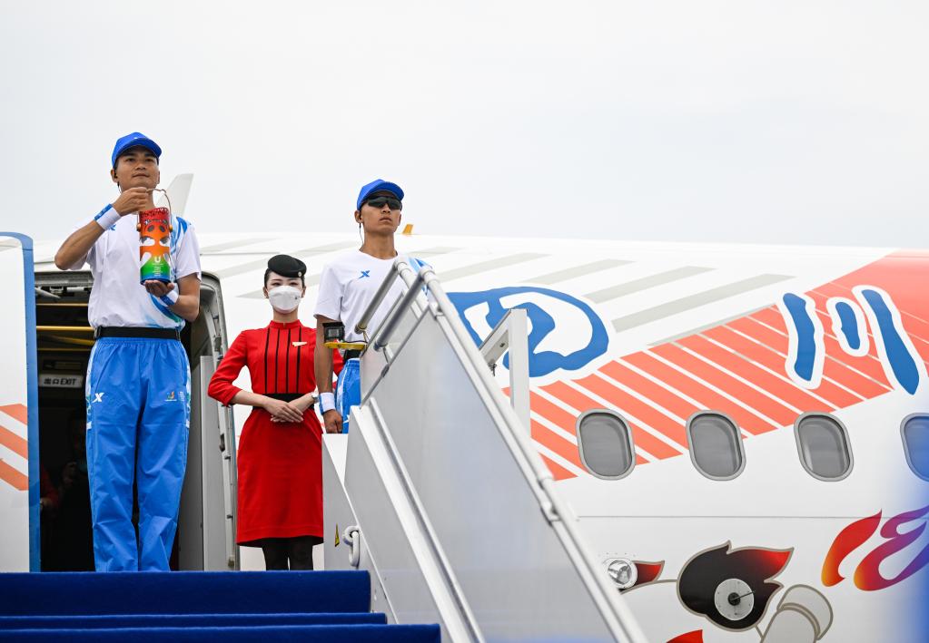 6月8日,在成都天府国际机场,护卫队队员登机前展示成都大运会火炬火种。新华社记者王曦摄