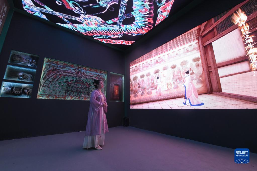 6月8日,一名身着传统服饰的观众在文博会甘肃展台观看数字敦煌展览。