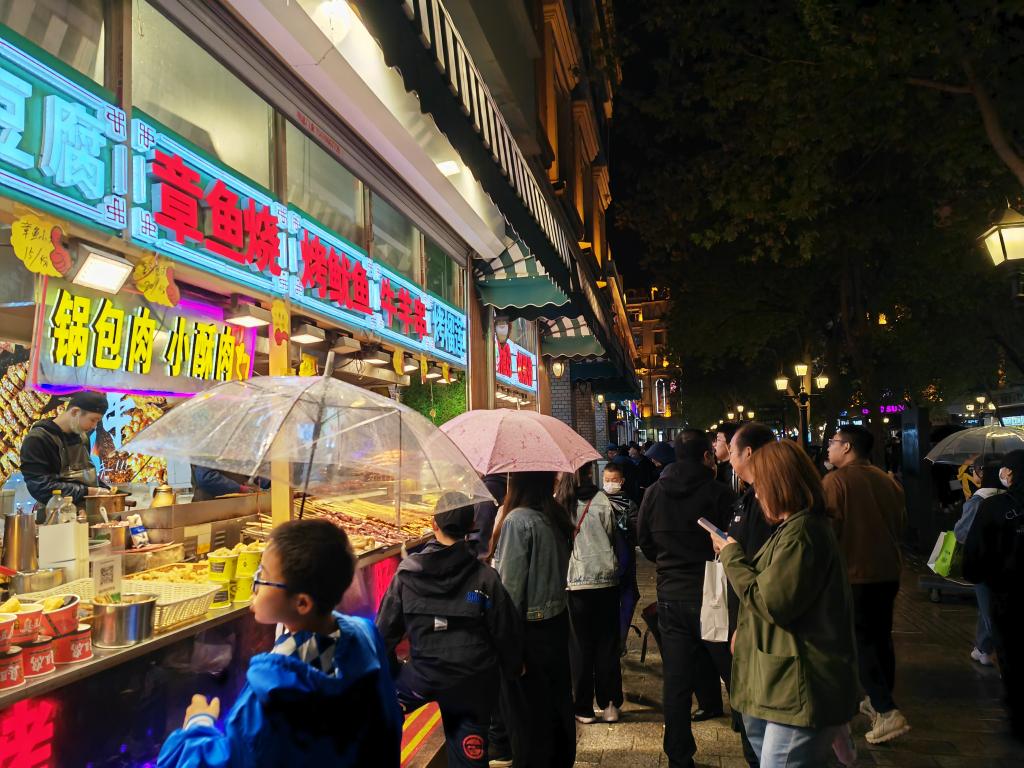雨夜,哈尔滨中央大街上依然人流如织。新华社记者朱悦 摄