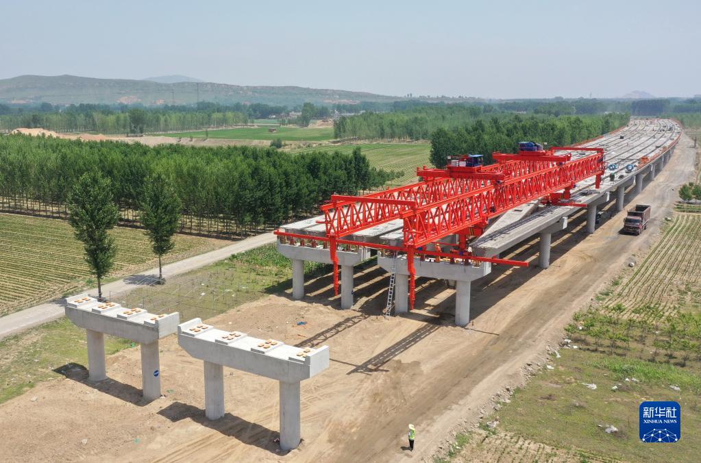 6月8日,工人在河北省昌黎县境内的秦唐高速三标段建设工地施工(无人机照片)。