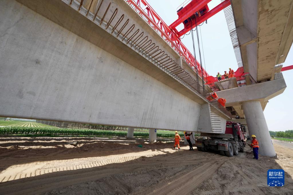 6月8日,工人在河北省昌黎县境内的秦唐高速三标段建设工地吊装预制梁。