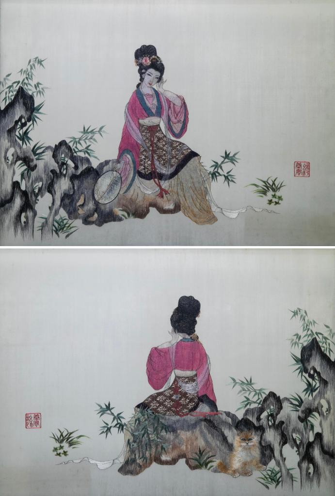 这是6月8日在重庆市渝中区的重庆渝康宁蜀绣艺术研究院拍摄的康宁异形绣作品《幽女神思》的正面(上)和背面(下)(拼板照片)。新华社记者 储加音 摄
