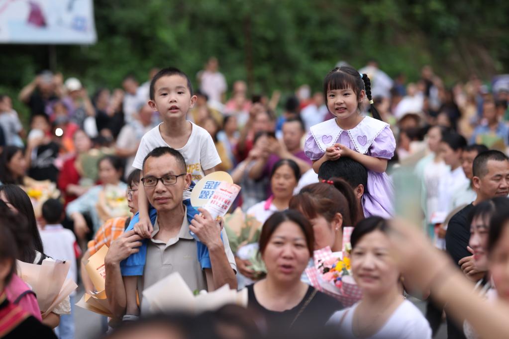 6月9日,在湖南省怀化市通道侗族自治县第一中学考点,家长带孩子等待哥哥姐姐走出校园。