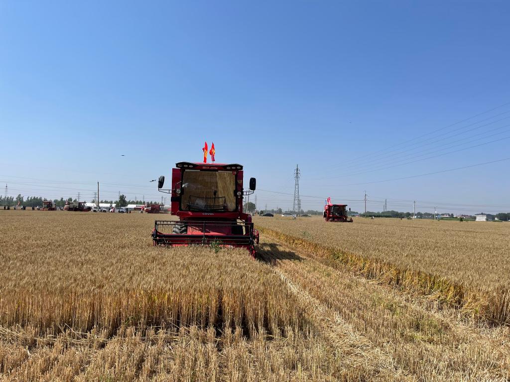 6日,河北省麦收“第一镰”在邯郸市魏县展开,东张岗村麦田里多台同型号的小麦联合收割机在对应地块进行收割,最终,农机手史红海的小麦机收损失率为0.31%,获得冠军。