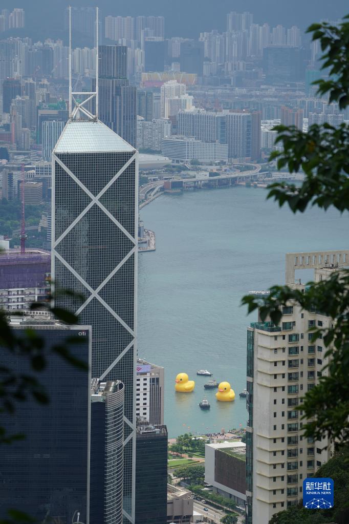 这是6月9日从港岛太平山顶拍摄的两只“大黄鸭”。新华社记者 吕小炜 摄