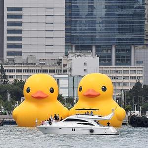 9日上午11时左右,两只高约18米的“大黄鸭”由香港会展中心附近起步,“游”至中西区海滨长廊。“大黄鸭”是荷兰艺术家弗洛伦泰因·霍夫曼的作品。他表示,本次展览双鸭同行,好事成双,希望两只“大黄鸭”的到来可以为香港增添双倍快乐。