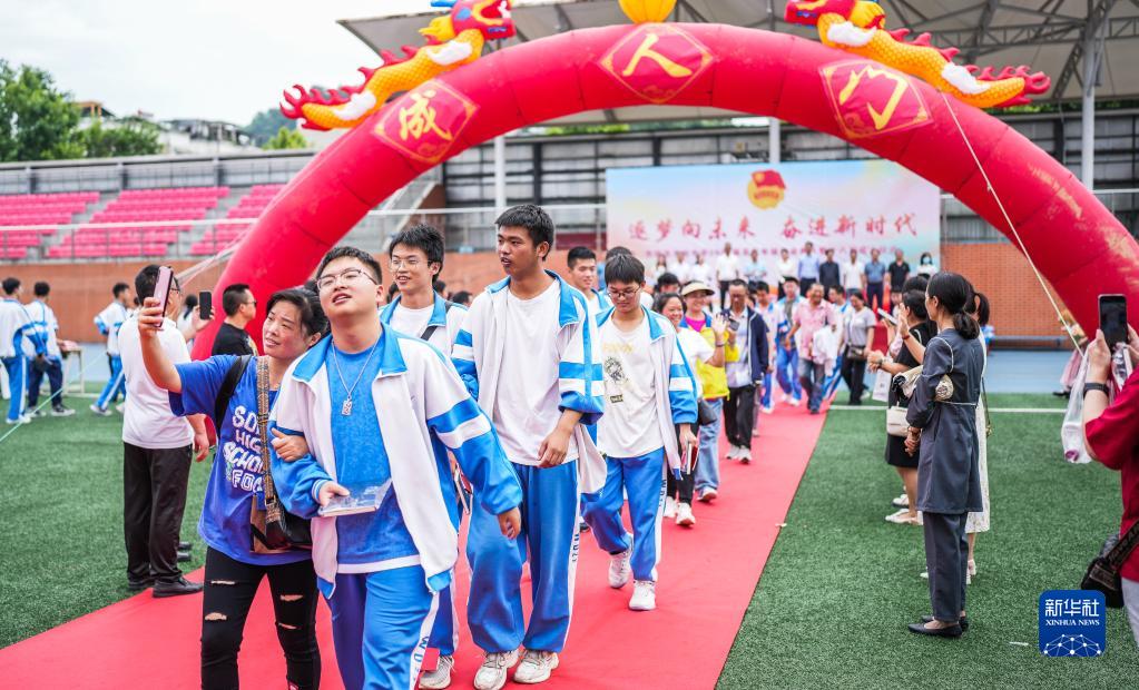 6月9日,乌当中学高三学生在毕业典礼上走过成人门。