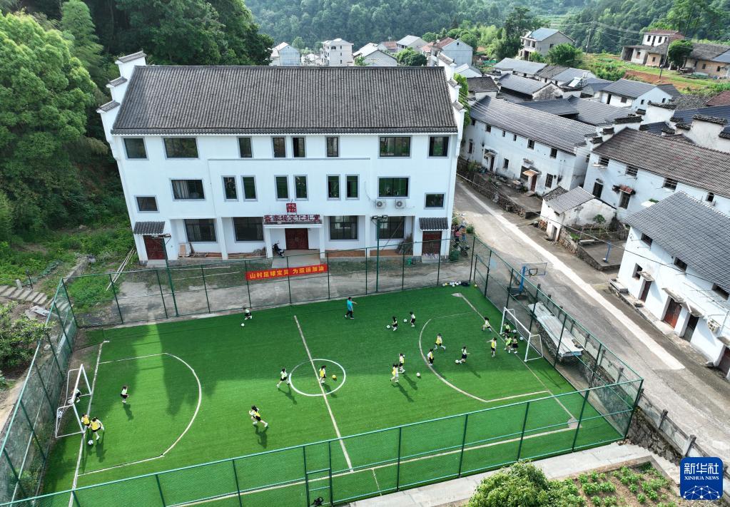 小学生在浙江诸暨市浬浦镇一座乡贤捐资兴建的足球场内踢球(5月25日摄)。