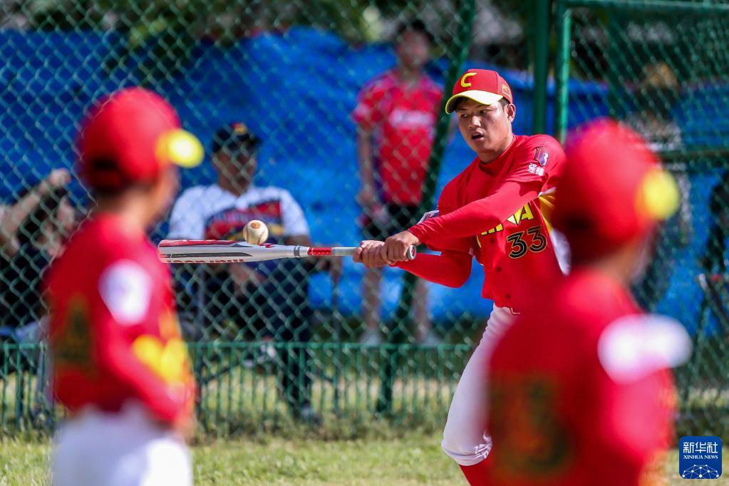 6月9日,凉山强棒队助理教练马虎在“小马世界少棒垒联盟”亚洲区U12组别小组赛对阵菲律宾一队赛前热身中击球。新华社发(乌马利摄)
