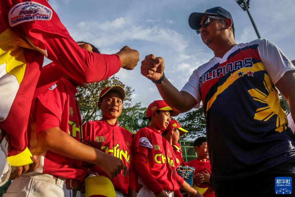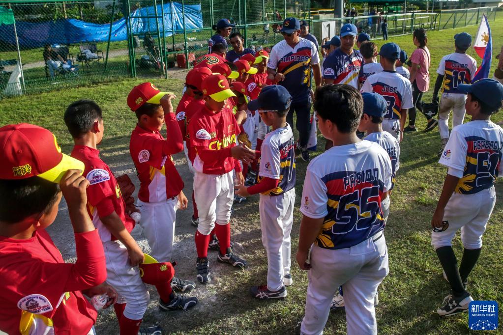 6月9日,凉山强棒队球员在“小马世界少棒垒联盟”亚洲区U12组别小组赛战胜菲律宾一队后与对方教练致意。新华社发(乌马利摄)