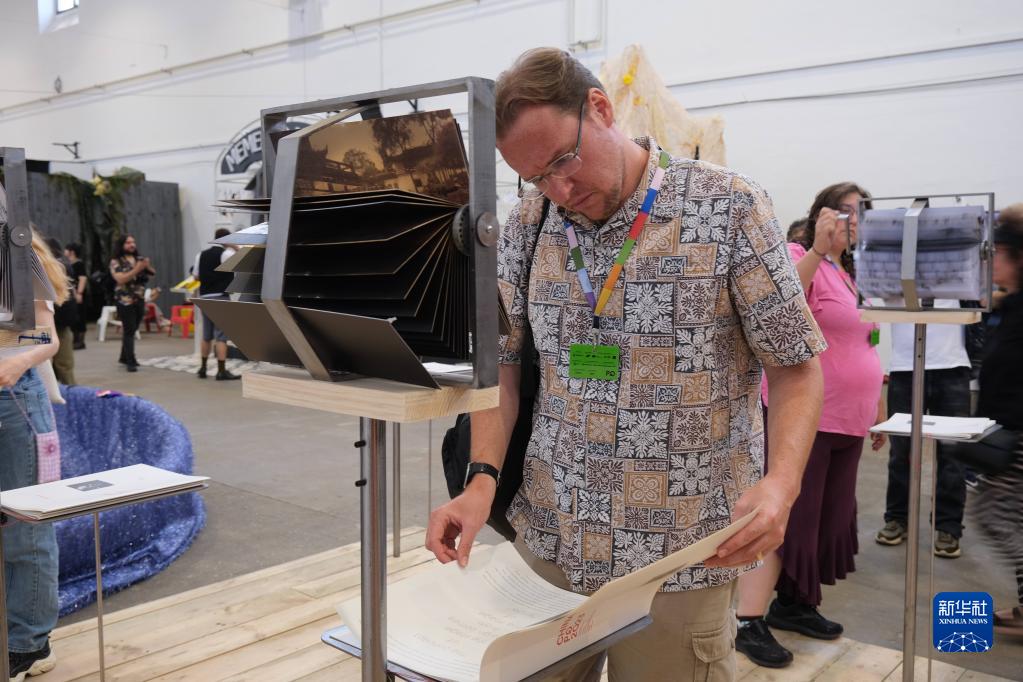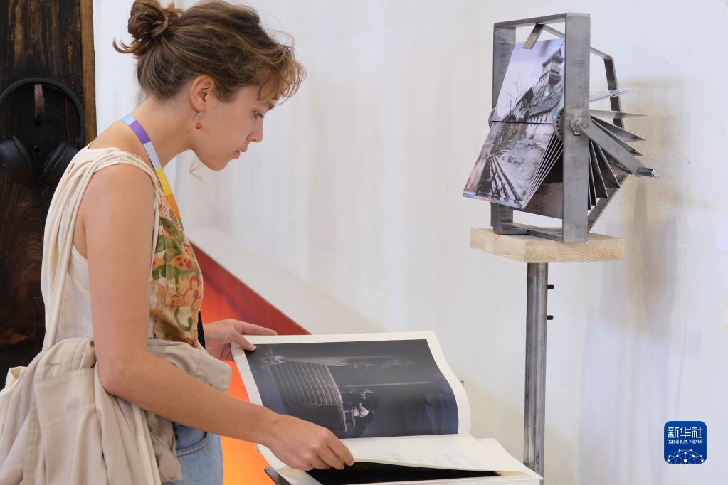6月11日,在捷克布拉格举行的布拉格演出设计与空间四年展上,一名女子参观中国国家展展区。新华社记者 邓耀敏 摄