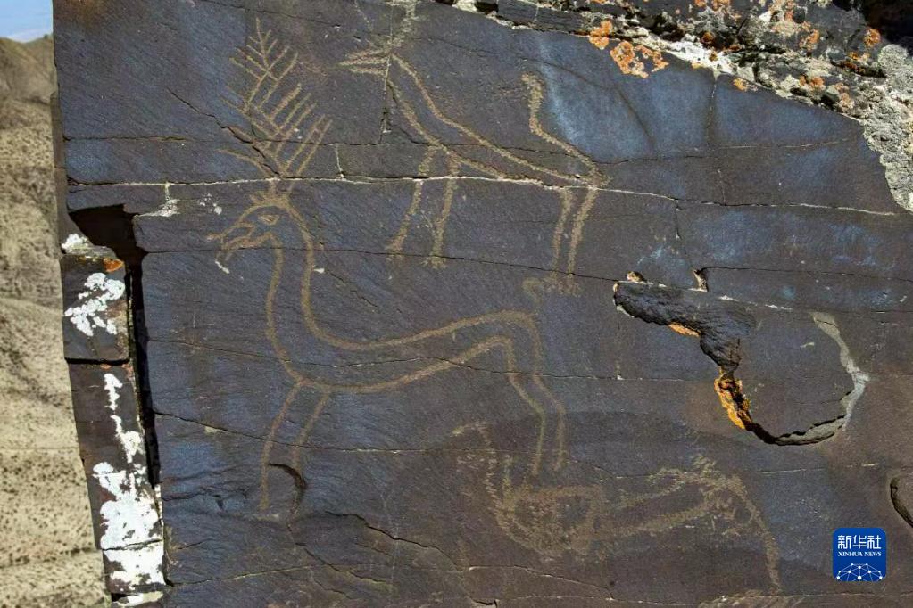 甘肃省酒泉市肃北蒙古族自治县旱峡岩画中的一幅鹿形、狼形岩画(资料照片)。 新华社发(敦煌研究院供图)