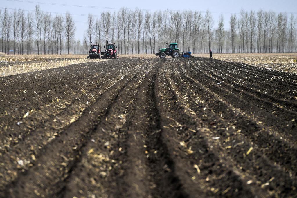 4月20日,在吉林省公主岭市秦家屯镇王家窝堡村,农机在进行整地作业。新华社记者许畅 摄