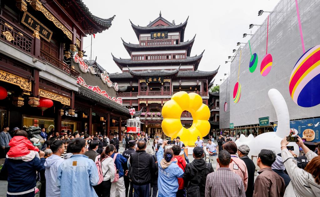 上海市民游客在上海豫园商城中心广场观看街头艺术表演(2023年5月7日)。新华社记者刘颖 摄