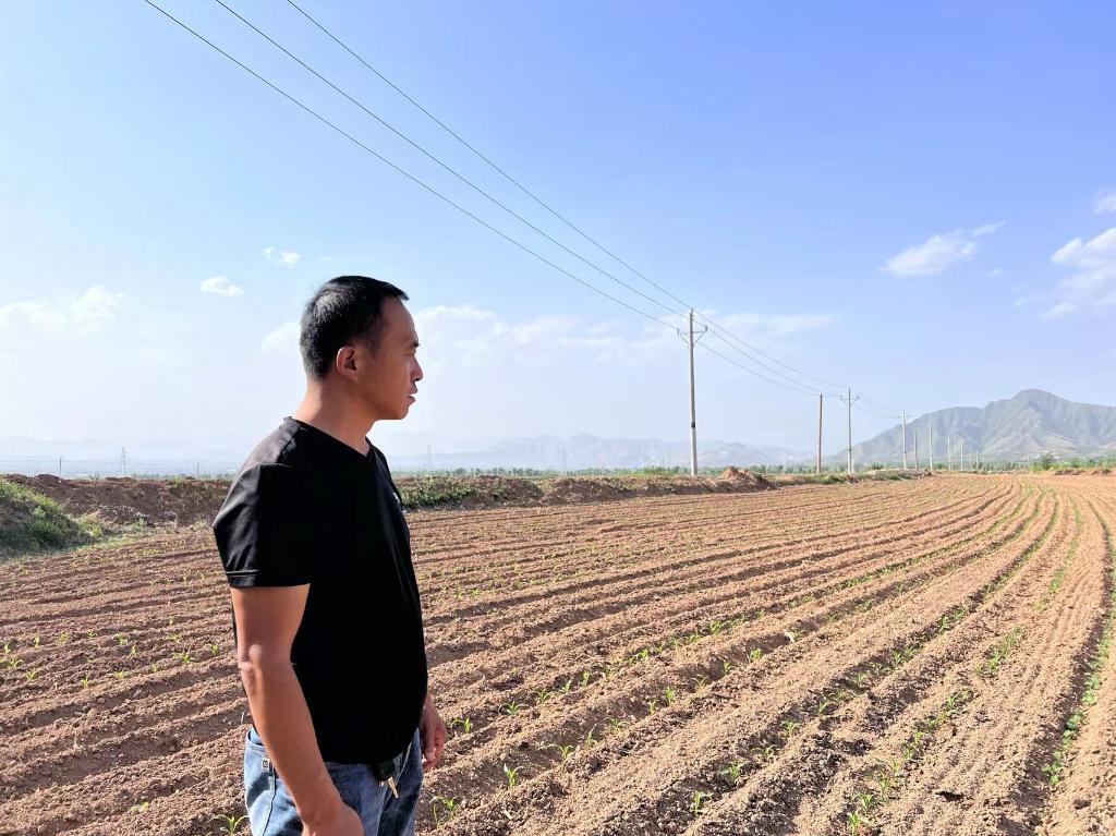 李志杰在地里察看秧苗。新华社记者 马晓洁 摄
