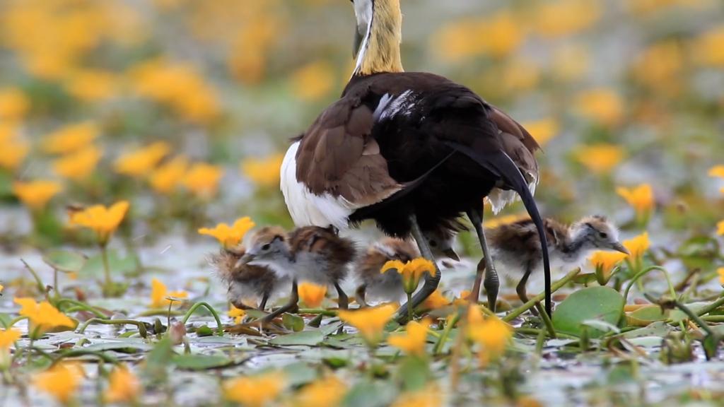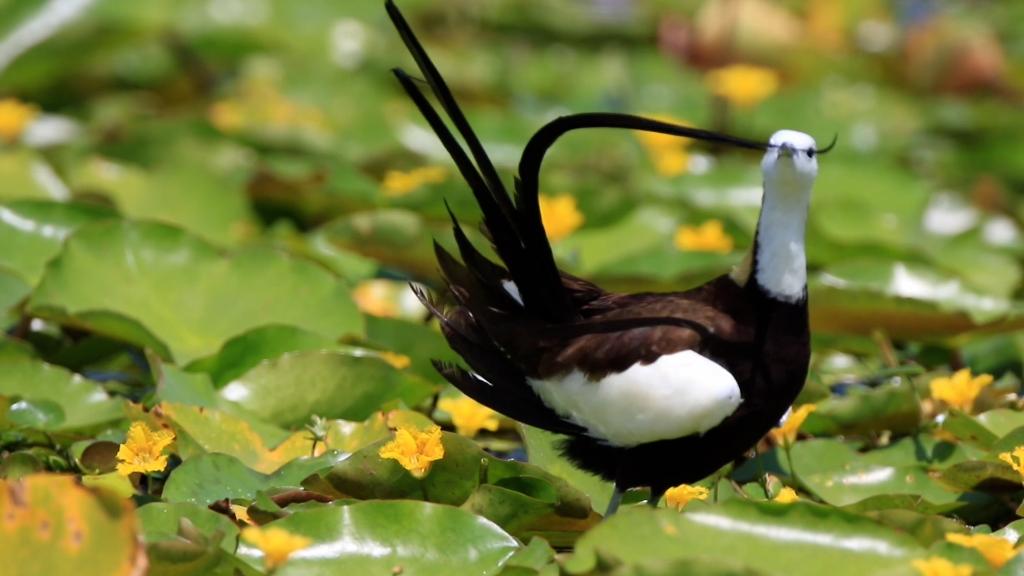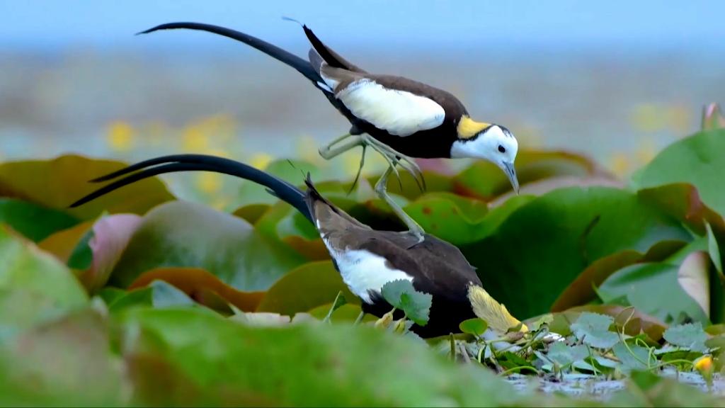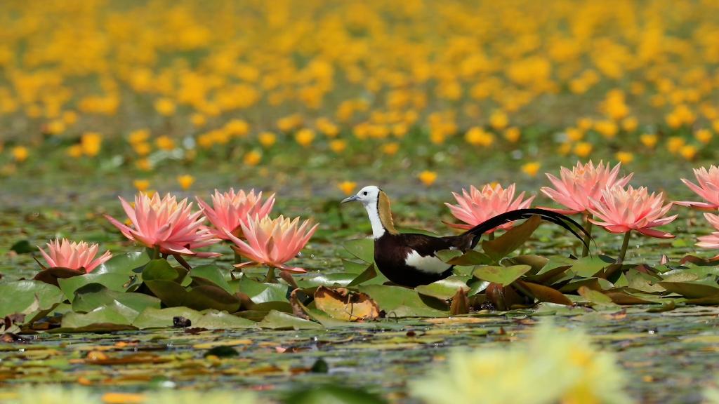 水雉拥有长长的脚趾和尾羽,可在浮叶植物上行走自如,被誉为“凌波仙子”。