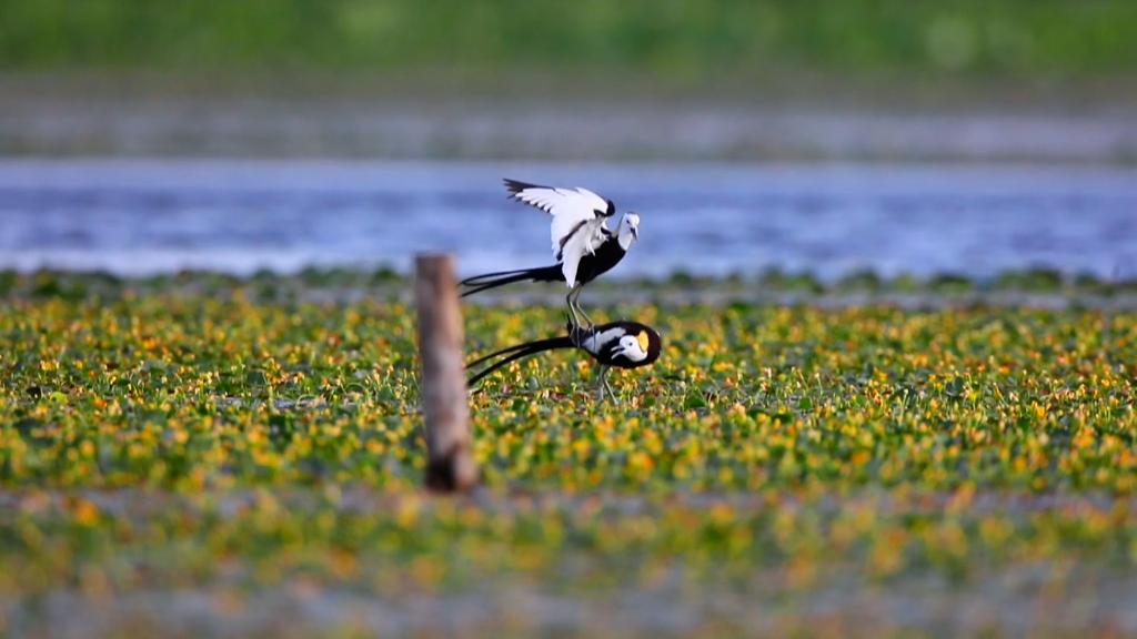 近日,在云南保山青华海国家湿地公园,一只雄性水雉从荇菜叶上起飞落在雌性水雉背上尝试“踩背”。
