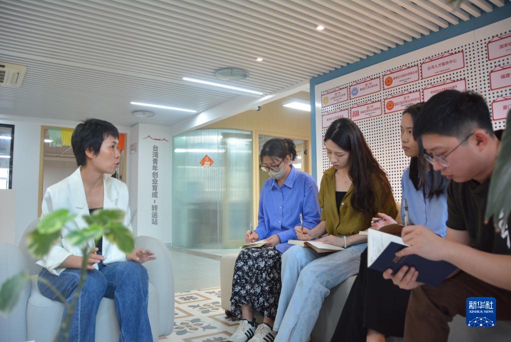 6月12日,聚融壹家台湾青年双创基地执行长左星星(左一)在与台青交流相关创业项目。新华社记者 颜之宏 摄