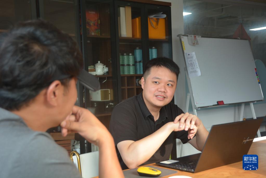 6月12日,台青张培轩与合作伙伴交流。新华社记者 颜之宏 摄