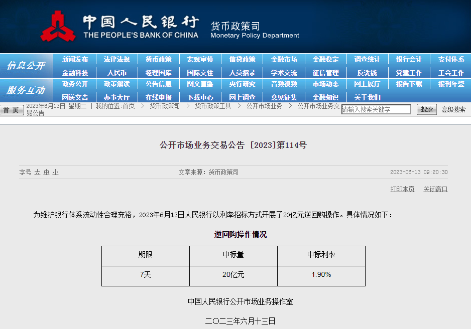 当日,中国人民银行发布公告称,为维护银行体系流动性合理充裕,以利率招标方式开展了20亿元逆回购操作。此次7天期逆回购操作的中标利率为1.90%,较此前下降了10个基点。