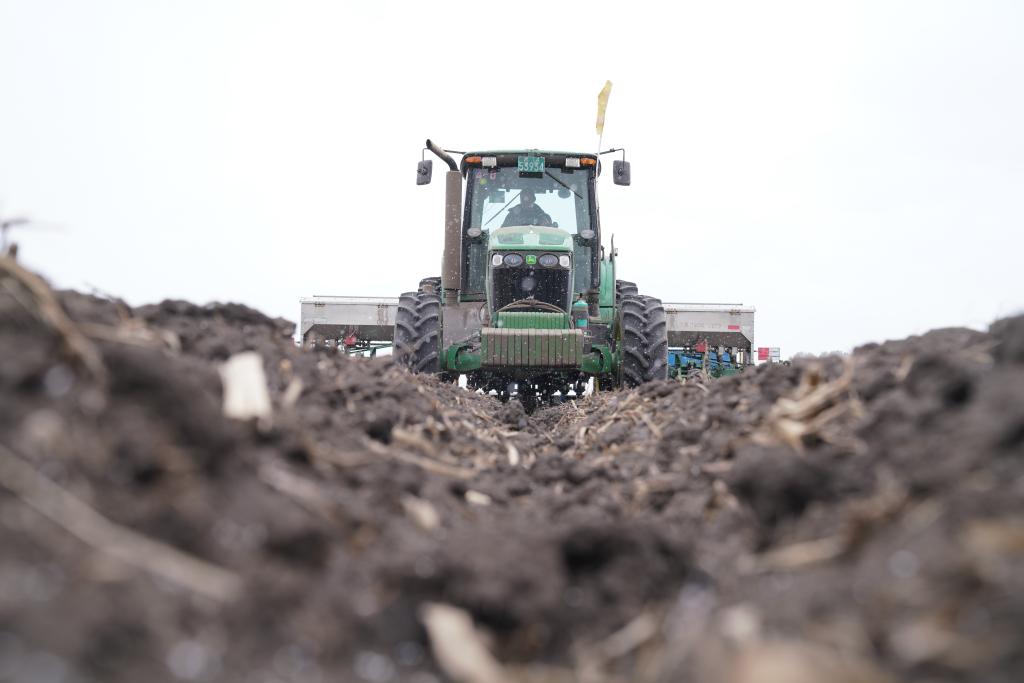 黑龙江一处农田中,拖拉机在进行施肥作业。新华社记者 王松4月12日摄