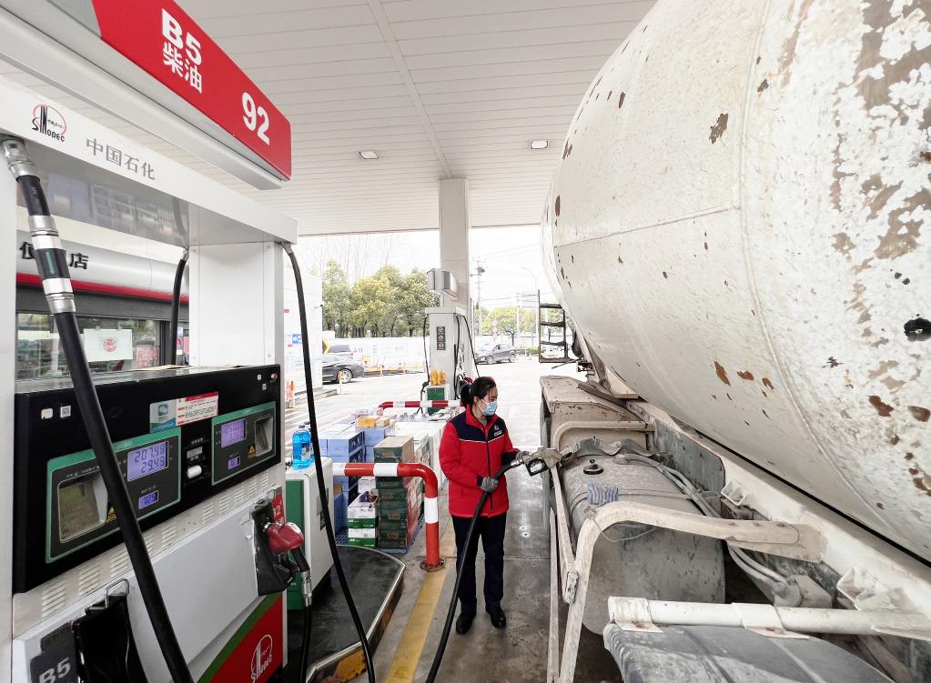 中石化加油站中工作人员正在给车辆加注B5生物柴油。受访单位供图