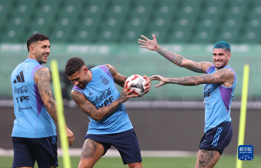 6月14日,阿根廷队球员德保罗(右)与队友奥塔门迪(中)在训练中。新华社记者 贾浩成 摄