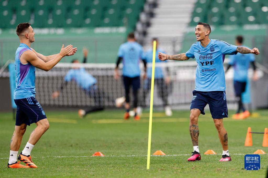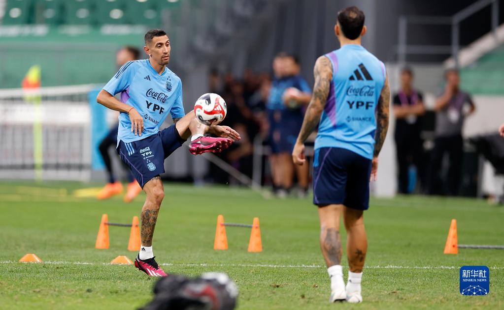 6月14日,阿根廷队球员迪玛利亚(右)在训练中。新华社记者 张晨 摄