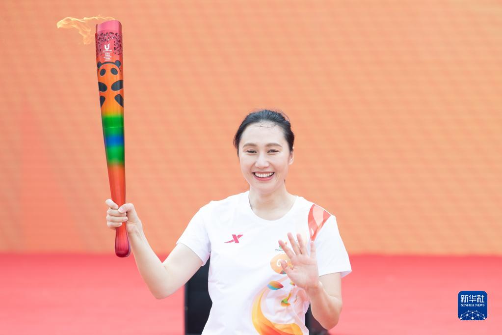 6月15日,火炬手张虹在火炬传递中。新华社记者 张涛 摄