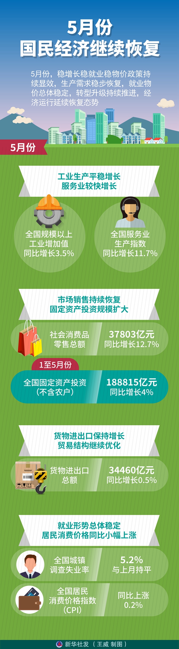 新华社北京6月15日电(记者魏玉坤、韩佳诺)国家统计局15日发布数据显示,5月份,稳增长稳就业稳物价政策持续显效,生产需求稳步恢复,就业物价总体稳定,转型升级持续推进,经济运行延续恢复态势。