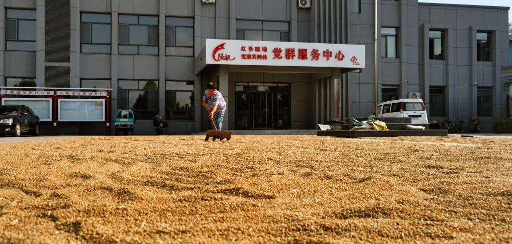 张秀梅正在德州市陵城区新城社区党群服务中心大院里晾晒小麦。(新华社记者叶婧 摄)
