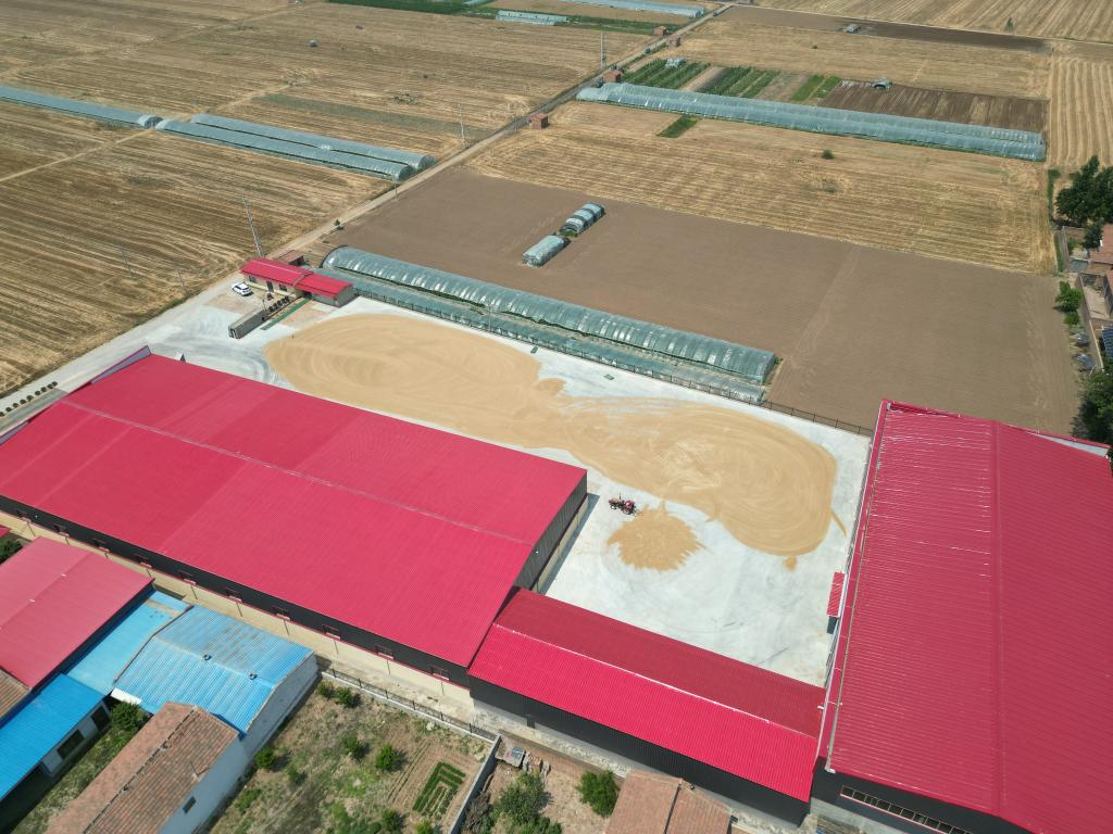 6月13日,农户在德州市临邑县临盘街道政府大院晒粮。(新华社记者徐速绘 摄)
