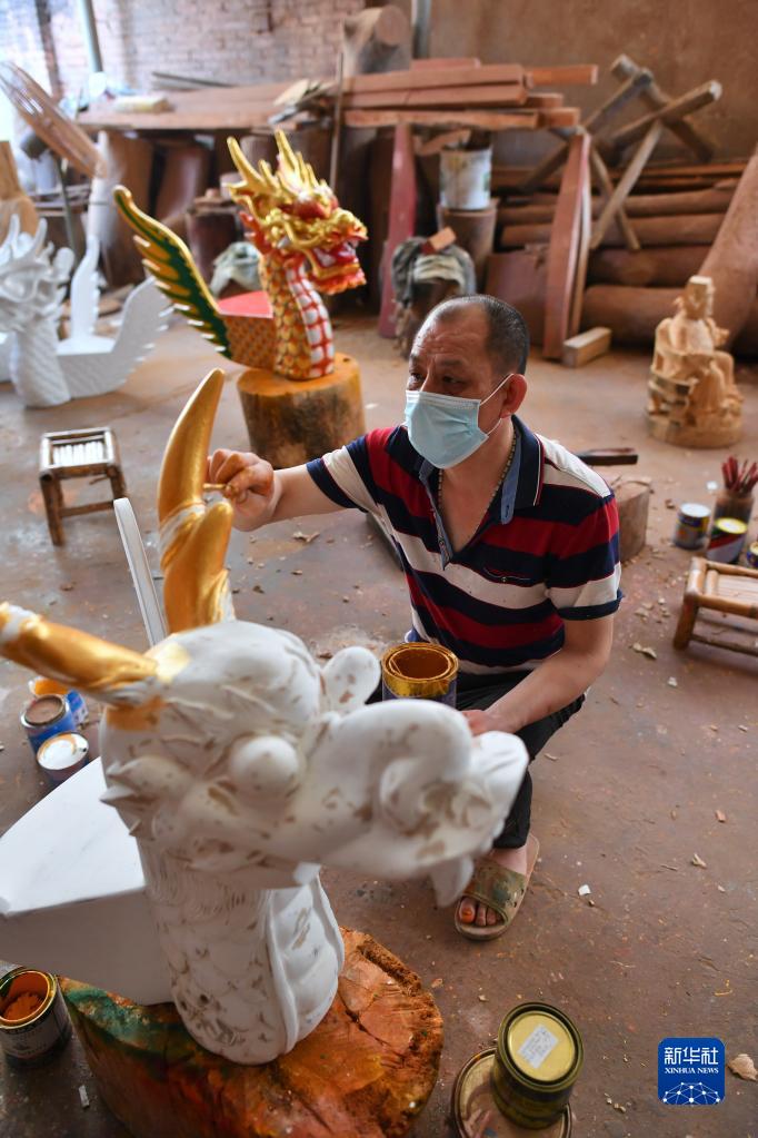 福州市闽侯县方庄村一位匠人在为新雕刻的龙舟龙头上漆(6月12日摄)。