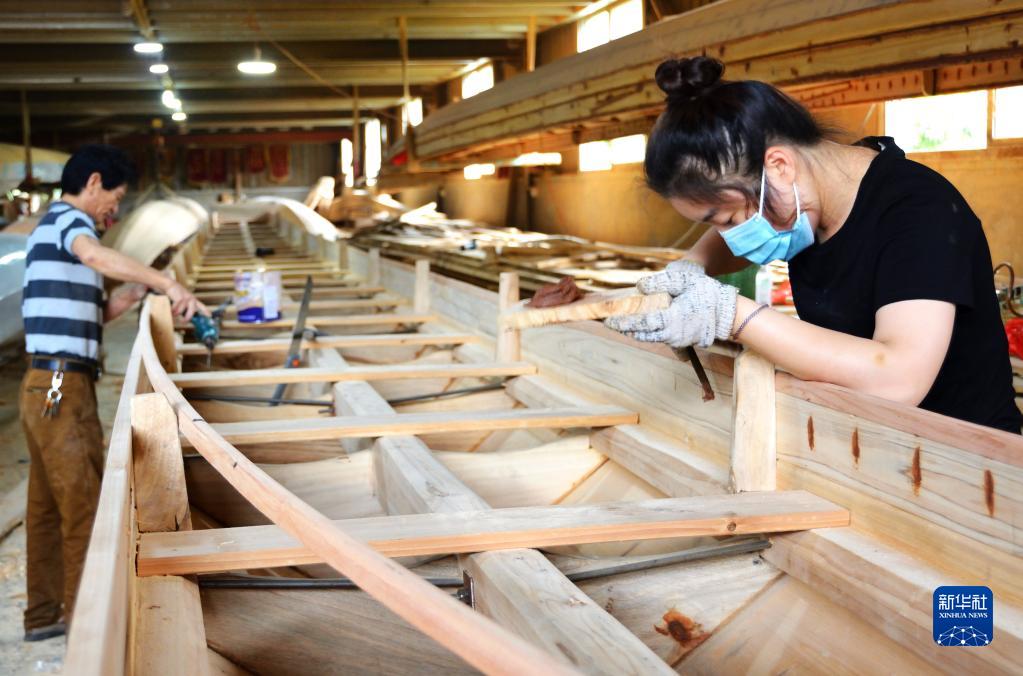 在福州市闽侯县方庄村“龙舟世家”方忠雄龙舟厂,工匠们赶制龙舟(5月23日摄)。