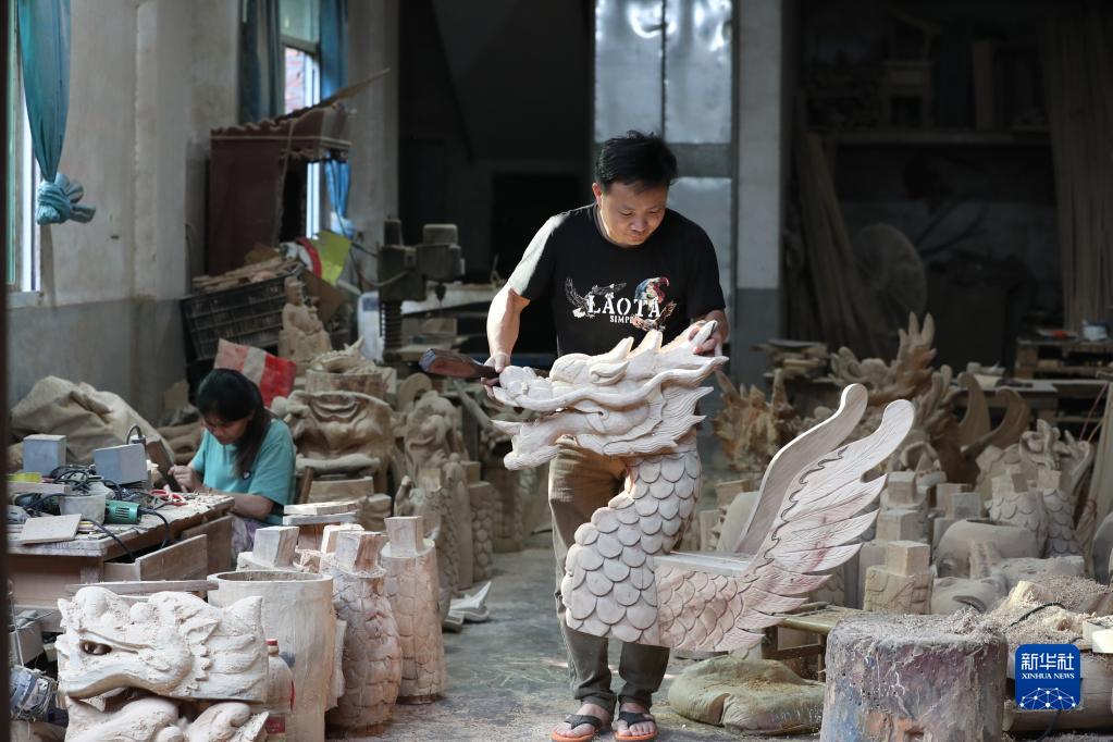 福州市闽侯县方庄村一位匠人搬运刚雕刻完成的龙舟龙头(6月12日摄)。
